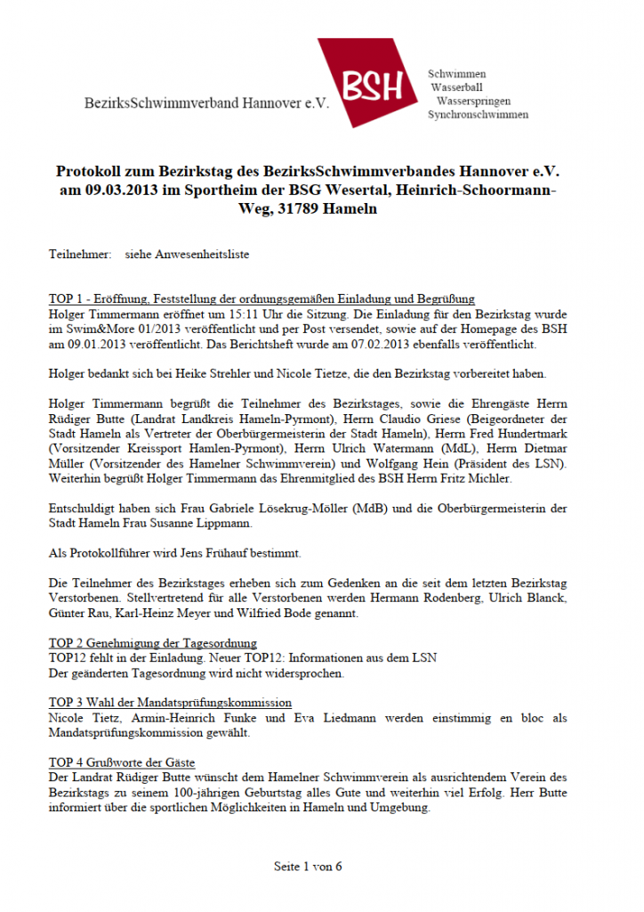 Für die schnelle Erstellung des Protokolls recht herzlichen Dank an Jens Frühauf. Einsprüche gegen das Protokoll sind bis 24.03.2013 an den Vorsitzenden des BSH, Holger Timmermann zu senden.