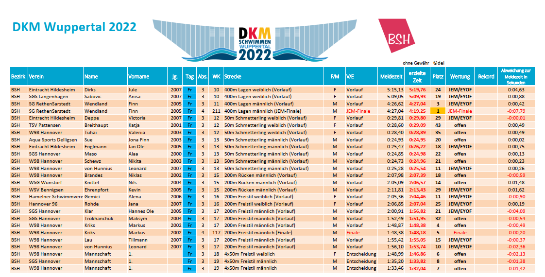Nachfolgend ein Gesamtüberblick über alle Ergebnisse der BSH-Aktiven: