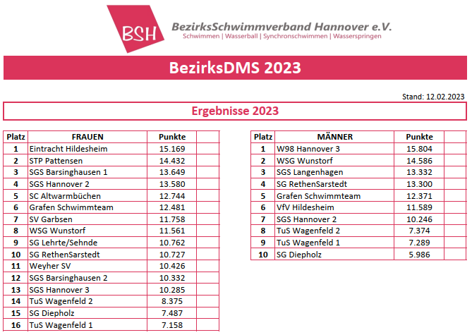 Die DMS Bezirksliga im Bezirkschwimmverband Hannover wurde am 11. und 12. Februar 2023 eintägig in zwei Gruppen in Hildesheim durchgeführt.
