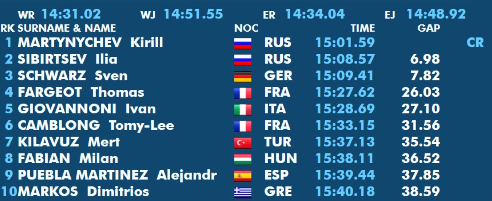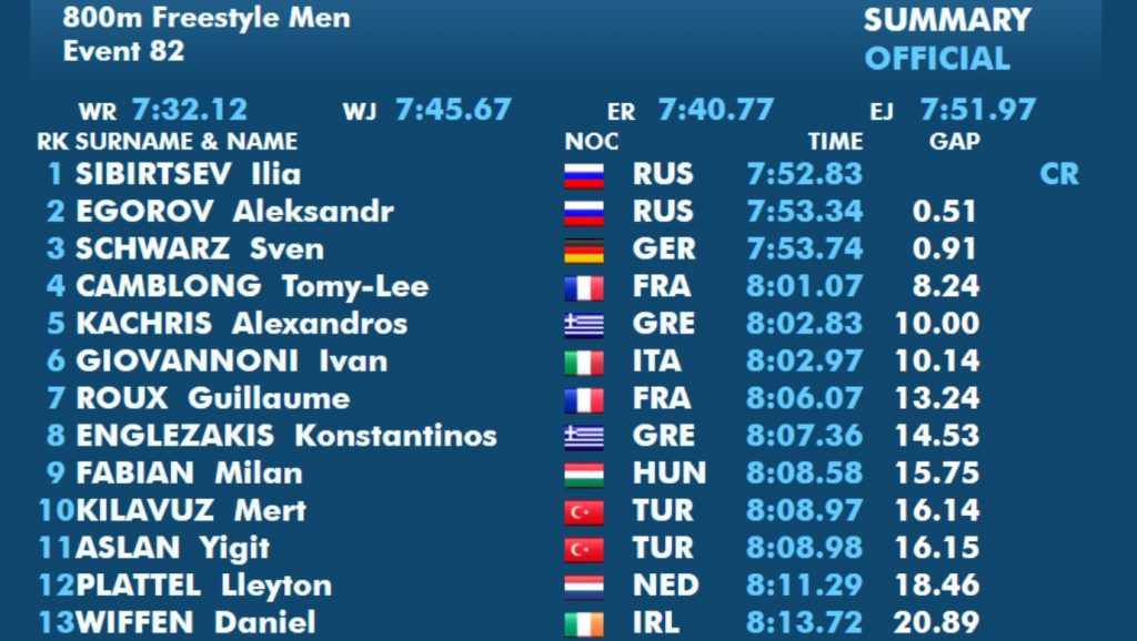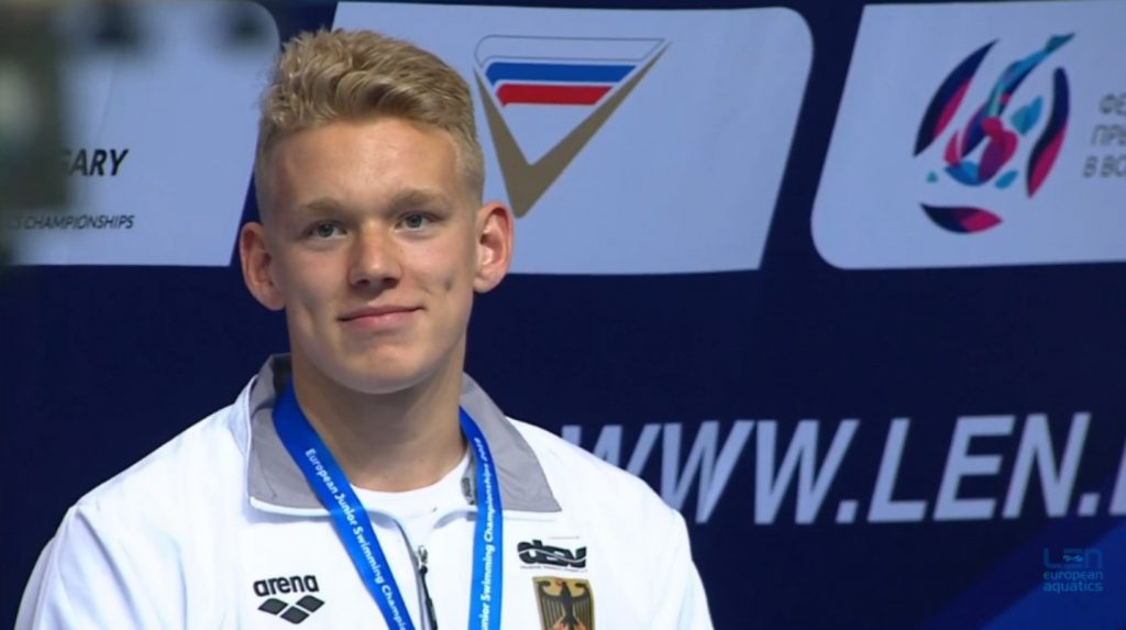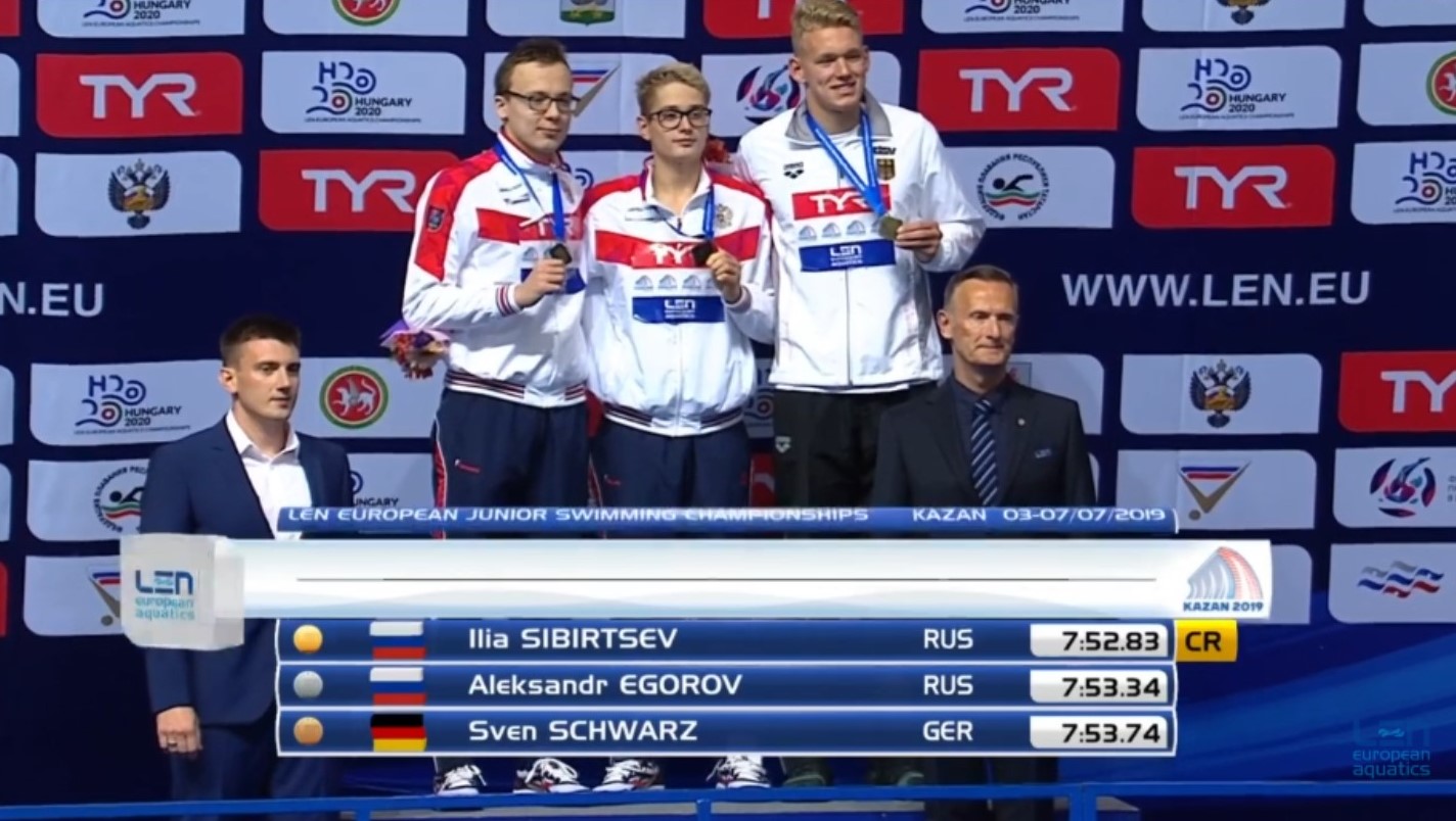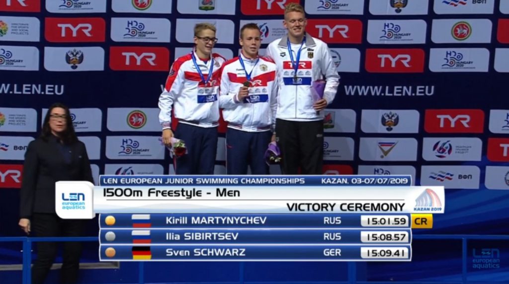 Am ersten Tag hatte Malin ihren Start über 50m Brust, hier belegte sie in einer Zeit von 0:33,05 min den 20. Platz. Am Donnerstag, dem zweiten Wettkampftag der JEM 2019, erkämpfte sich Sven mit einer neuen Bestzeit von 15:09,41 min die Bronzemedaille. In einem tollen Rennen verbesserte er nicht nur seinen eigenen Landesrekord um 15 Sekunden, den er erst im April aufstellte, auch strich er damit den fast 35 Jahre bestehenden Deutschen Altersklassenrekord von Uwe Daßler (15:11,14 min) aus den Büchern.