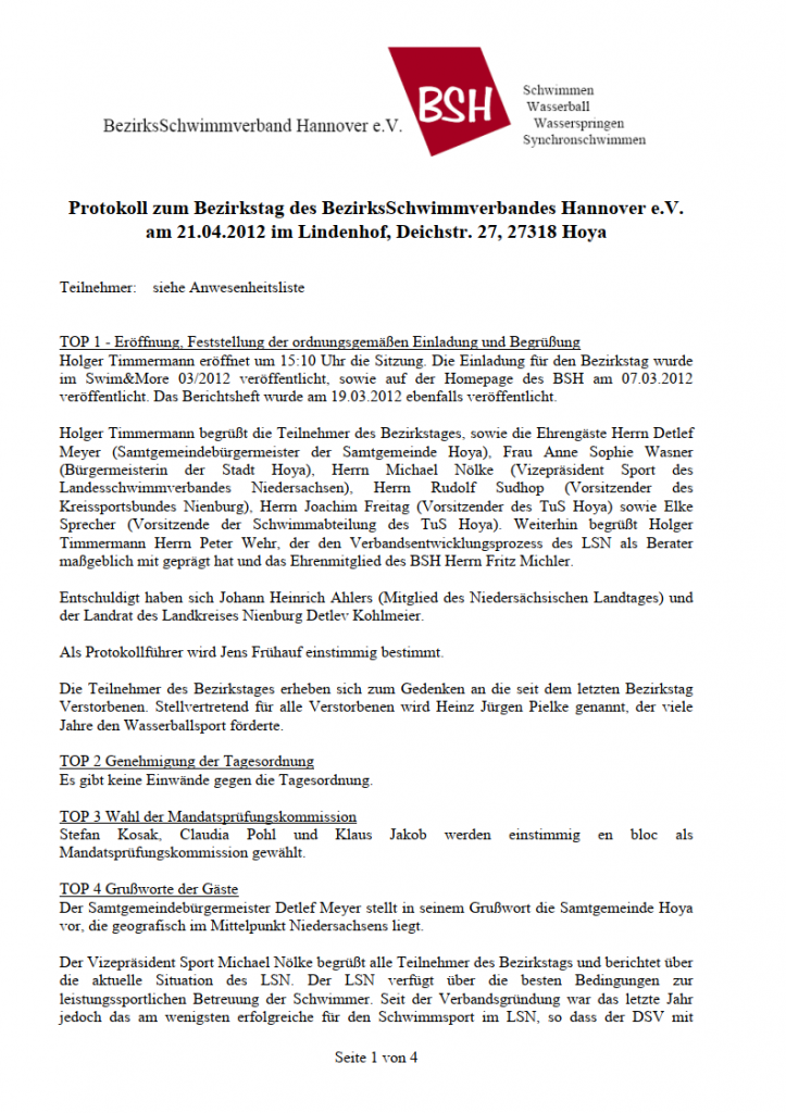 Einsprüche gegen dieses Protokoll sind bis zum 12.05.2012 an den Vorsitzenden des BezirksSchwimmverbandes Hannover – Holger Timmermann, Steige 2, 37603 Holzminden – Mail: holger.timmermann [at] bezirksschwimmverband-hannover.de zu richten.