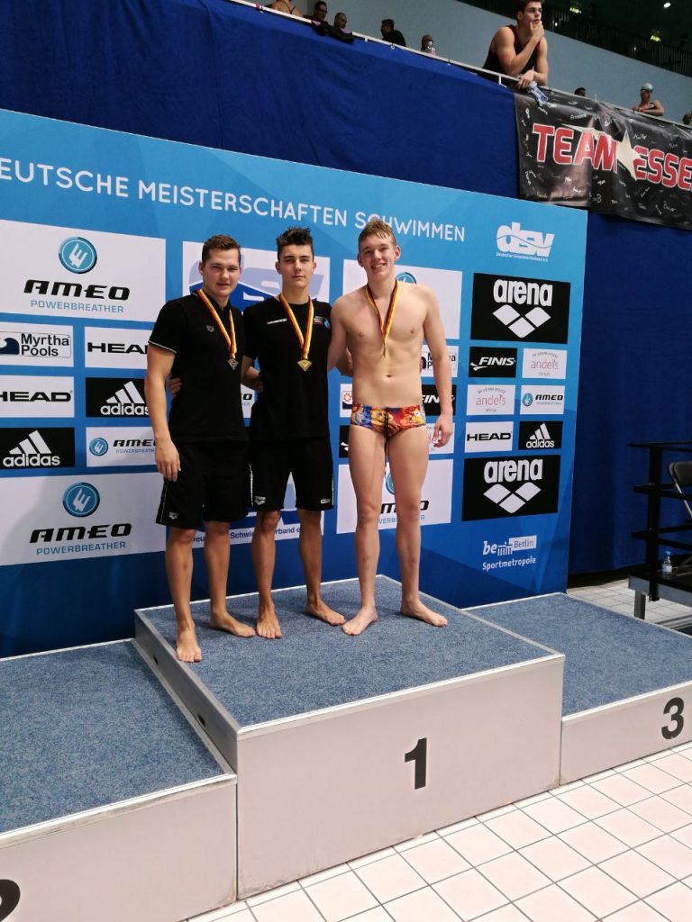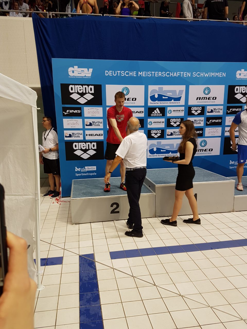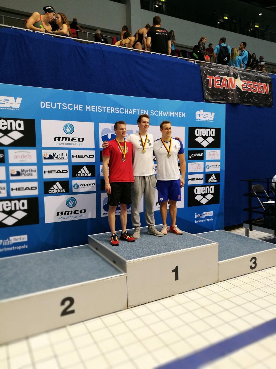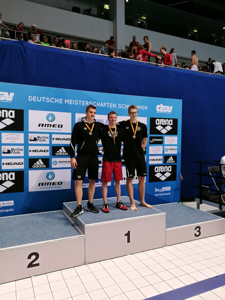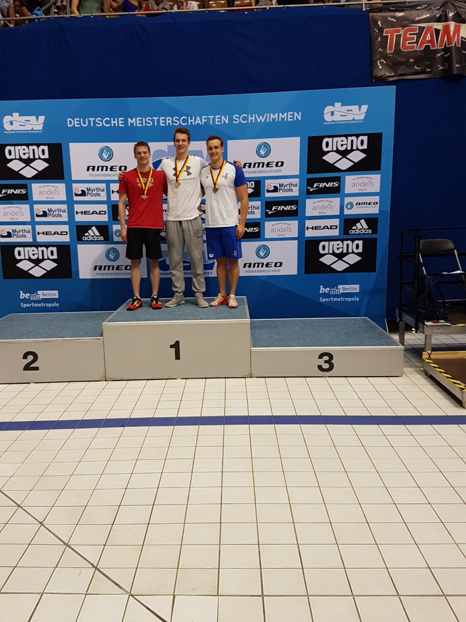 Deutscher Meister und Gewinner der Goldmedaille in der offenen Wertung über 200m Brust wurde Ruben Reck in 2:07,76 min, er schwamm damit auch einen neuen Landesrekord. Gold in der Juniorenwertung und einen neuen Deutschen Altersklassenrekord erschwamm Sven Schwarz über 1500m Freistil in 15:12,13 min. Silber holte sich Ruben im Finale über 200m Lagen in 1:57,83 min und den Medaillensatz machte er über 100m Brust komplett, hier belegte er in neuer Landesrekordzeit von 0:59,26 min den Bronzerang. Sven holte sich über die 400m Freistil in 3:53,88 min die Bronzemedaille in der Juniorenwertung und konnte im B-Finale am Nachmittag mit den zweiten Platz in 3:50,87 min einen neuen Deutschen Altersklassenrekord erzielen.