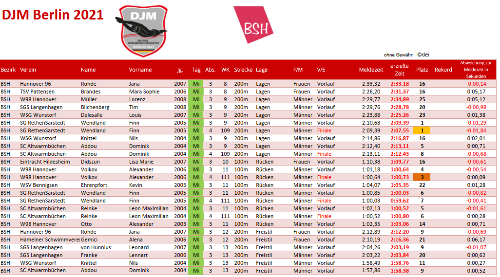 Auch am zweiten Tag der Deutschen Jahrgangsmeisterschaften 2021 zeigten die Aktiven aus den BSH-Vereinen wieder tolle Leistungen. Zwanzig Vorlaufstarts standen auf dem Programm, neun neue Bestzeiten, acht TOP 10-Platzierungen und fünf Finalqualifikationen waren die Ausbeute des Vormittags.
