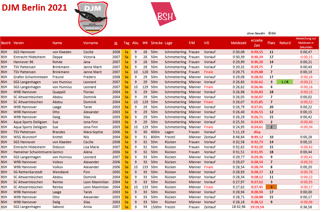 Am fünften und letzten Tag der Deutschen Jahrgangsmeisterschaften 2021 in Berlin standen 26 Vorlaufstarts für die Aktiven aus den BSH-Vereinen auf dem Programm. Den Großteil davon machten die Starts über 50m Schmetterling und 50m Rücken aus, alleine hier gingen die BSH-Aktiven 23mal an den Start. 400m Lagen weiblich, 800m Freistil männlich und 1500m Freistil weiblich bildeten die drei verbleibenden Starts.