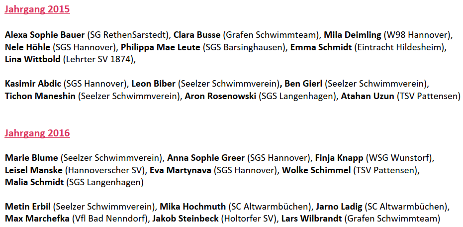 herzlichen Glückwunsch zu den tollen Bestzeiten und Platzierungen bei den Bezirks- und den Landesjahrgangsmeisterschaften auf der Kurzbahn im Stadionbad in Hannover. Wir haben den Wettkampf und die aktuellen Bestenlisten ausgewertet und nominieren hiermit die Auswahlmannschaft des BezirksSchwimmverbandes Hannover für die Teilnahme am 18. LSN-Team-Bezirks-Cup 2025.