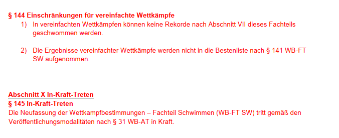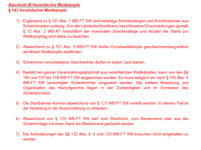 Diese betreffen die Aufnahme von vereinfachten Wettkämpfen in das Regelwerk (Neuaufnahme der §§ 143 und 144 im Fachteil Schwimmen)